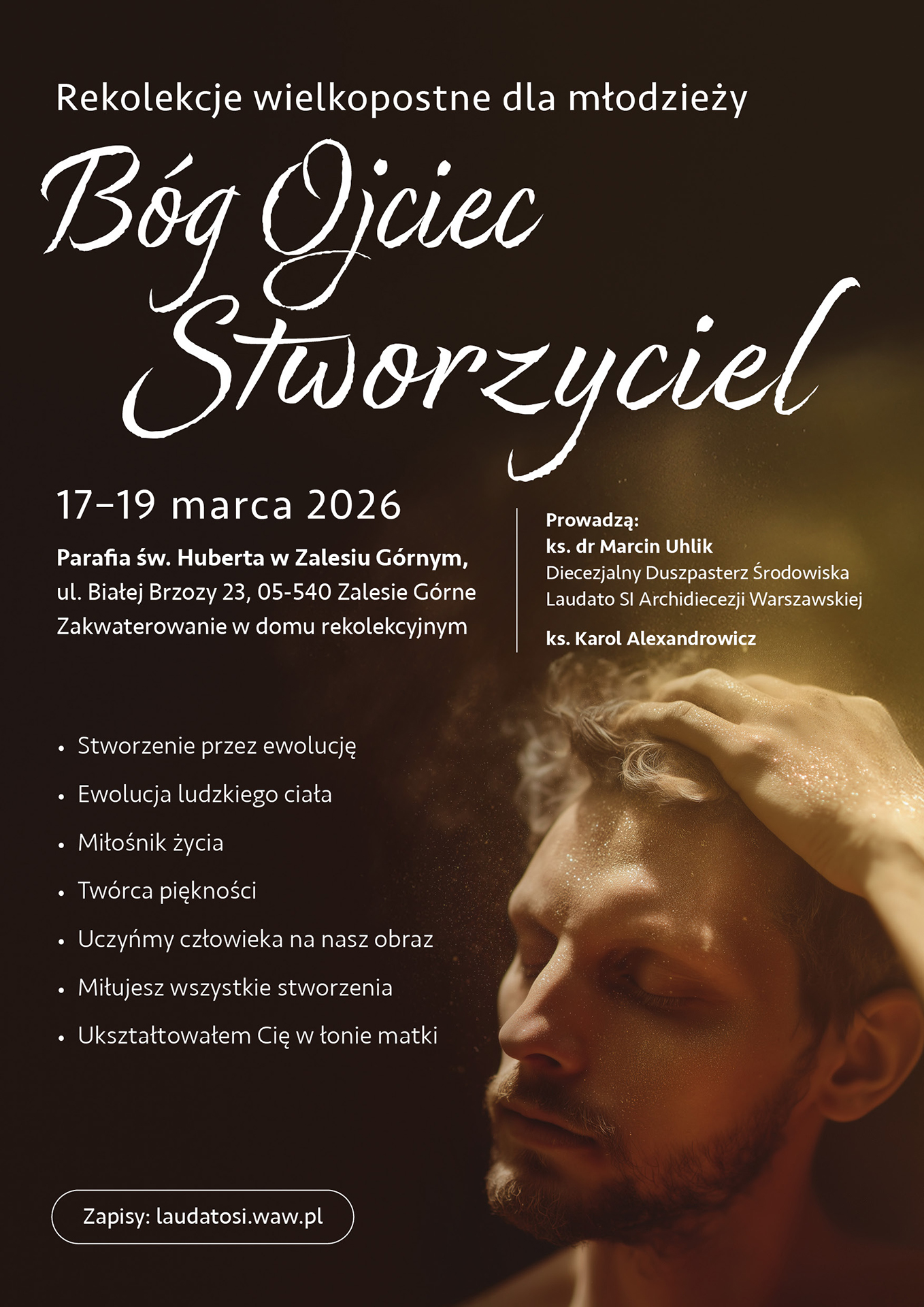 Zapraszamy uczniów szkół średnich i studentów na rekolekcje wielkopostne Bóg Ojciec Stworzyciel. Odbędą się one w dniach 17-19 marca 2026, w Domu Rekolekcyjnym w Parafii św. Huberta w Zalesiu Górnym, ul. Białej Brzozy 23, 05-540 Zalesie Górne. Rekolekcje są organizowane przez Duszpasterstwo Laudato SI Archidiecezji Warszawskiej. Poprowadzą je ks. dr Marcin Uhlik i ks. Karol Alexandrowicz. Zasadniczym tematem rekolekcji będzie refleksja nad Bogiem Ojcem Stworzycielem i Jego uwielbienie.